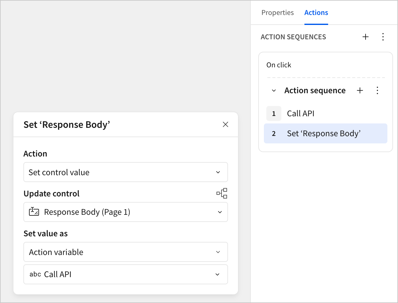 In this example and others, the response body is displayed using a text area control. Though other controls can be used to display outputs from a Call API action, the data type of the control must match the data type of the action variable. For the response data, the data type is text, which matches that of the text area control.