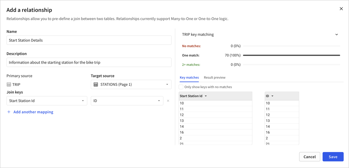 (Optional) Review the key matching details for the source and target elements to validate that your relationship is set up on the correct keys. Select Result preview to confirm the output of the relationship looks as expected.