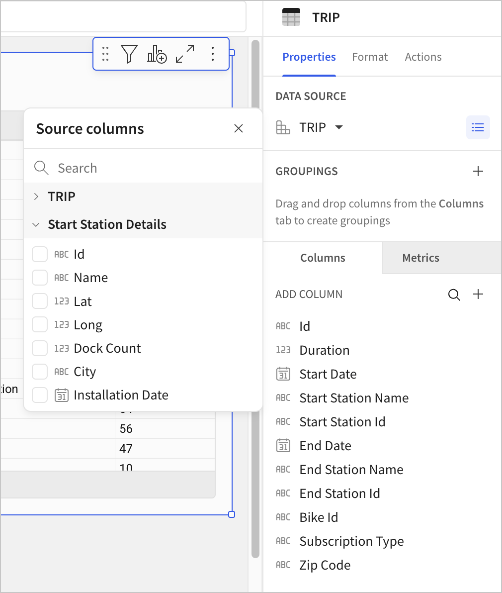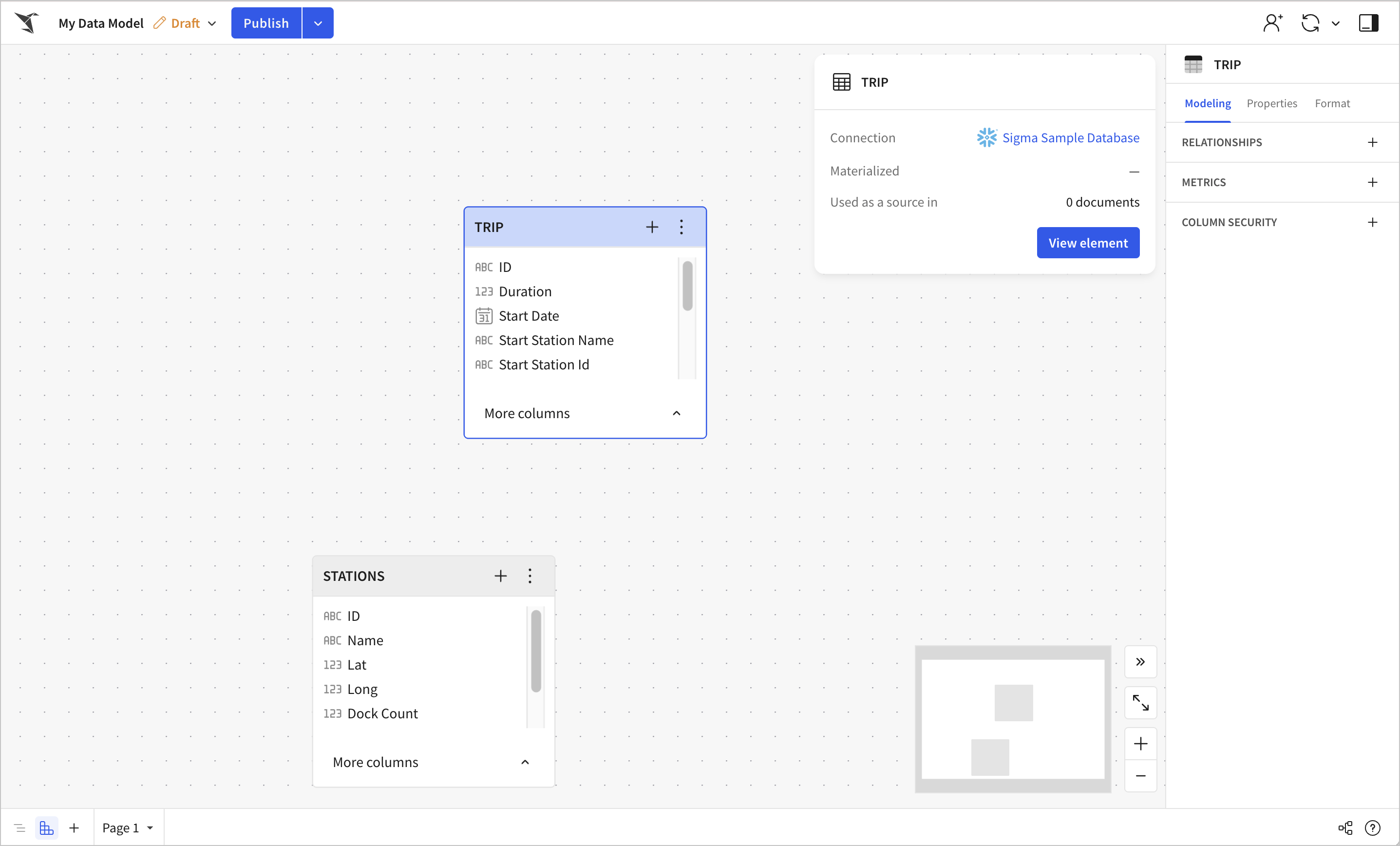Then, after publishing the data model, business analysts can work with the TRIP table from the data model, easily adding related columns from the STATIONS table. Sigma performs a join based on the logic defined in the relationship, and the join is only executed when the related columns are added to the workbook:
