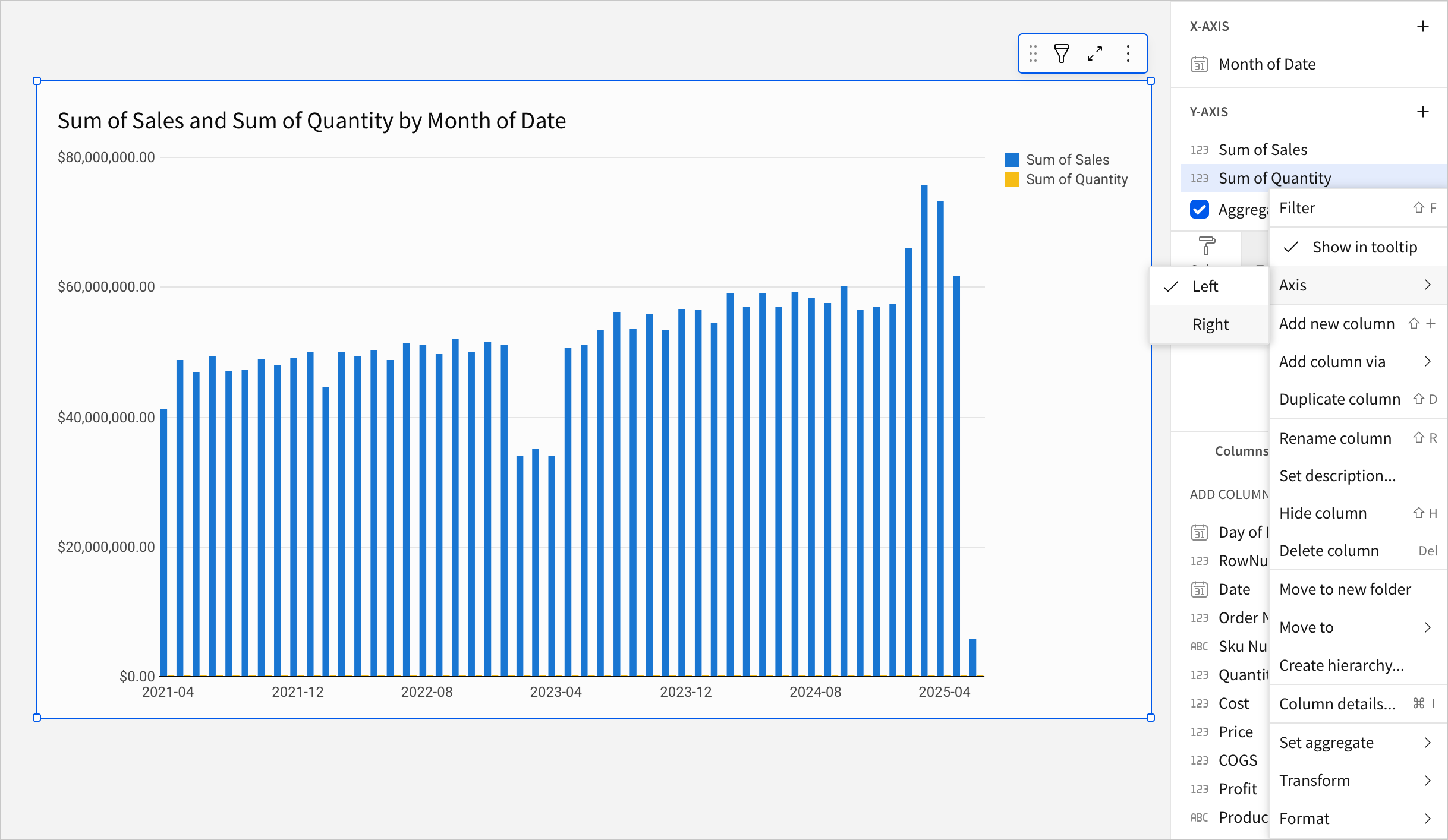 In the column menu, hover over Axis and select Left or Right.