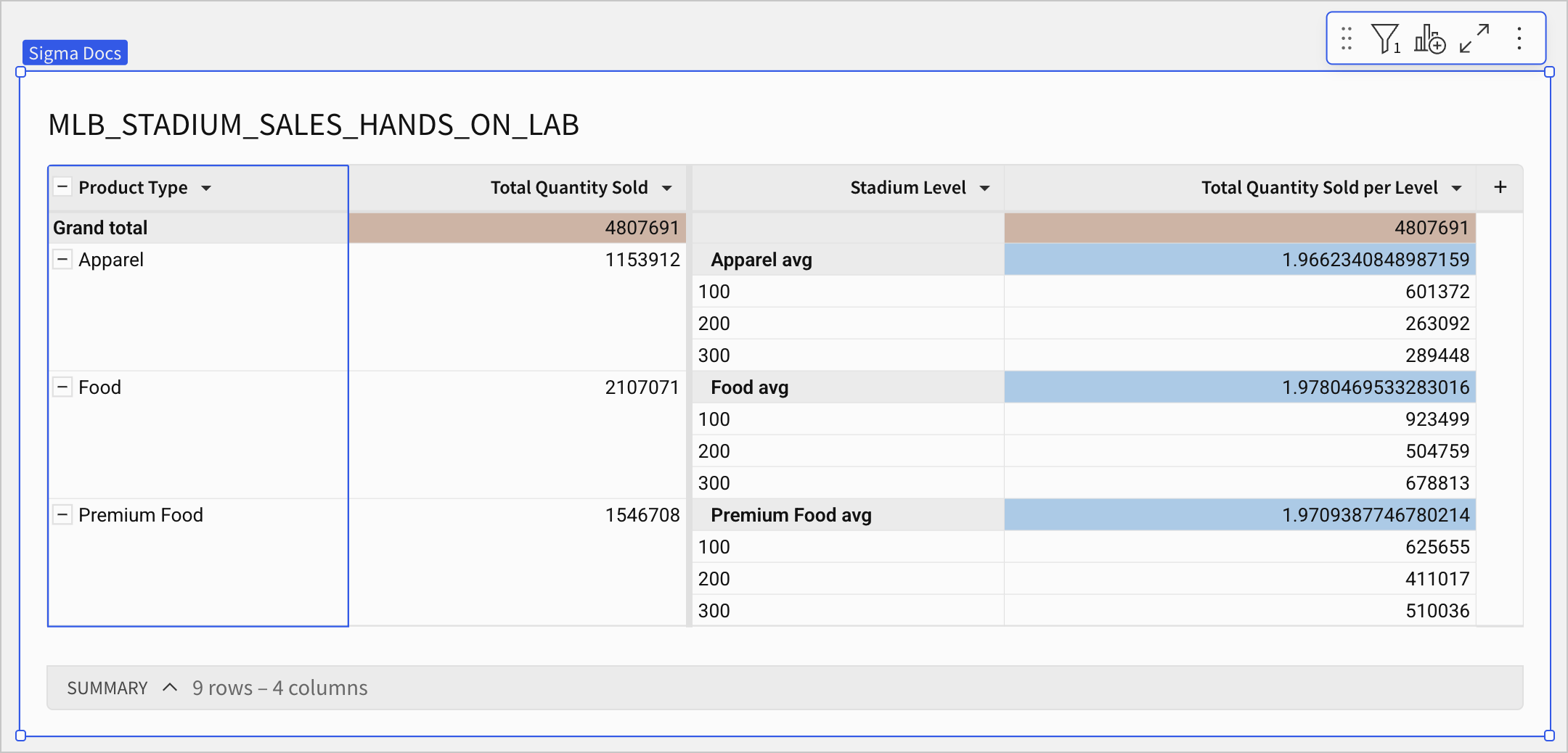 - Add a second grouping with the Stadium Level column and a calculation of Sales Quantity, which auto-aggregates to Sum of Sales Quantity. Rename the column Total Quantity Sold per Level.