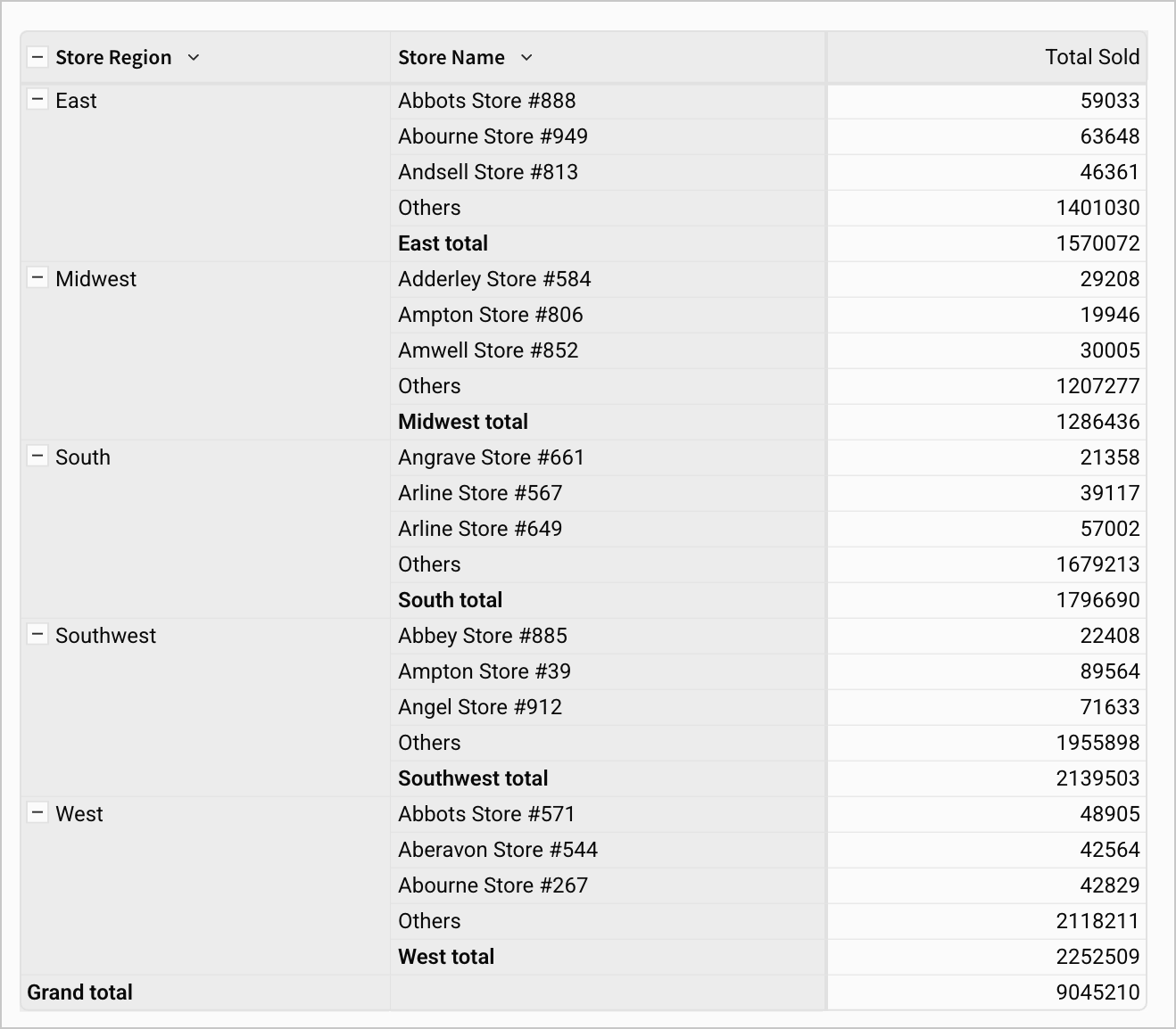 In a pivot table with pivot rows of Store Region and Store Name, and a values column Total Sold, you can limit the store names to the top 3 in each region: